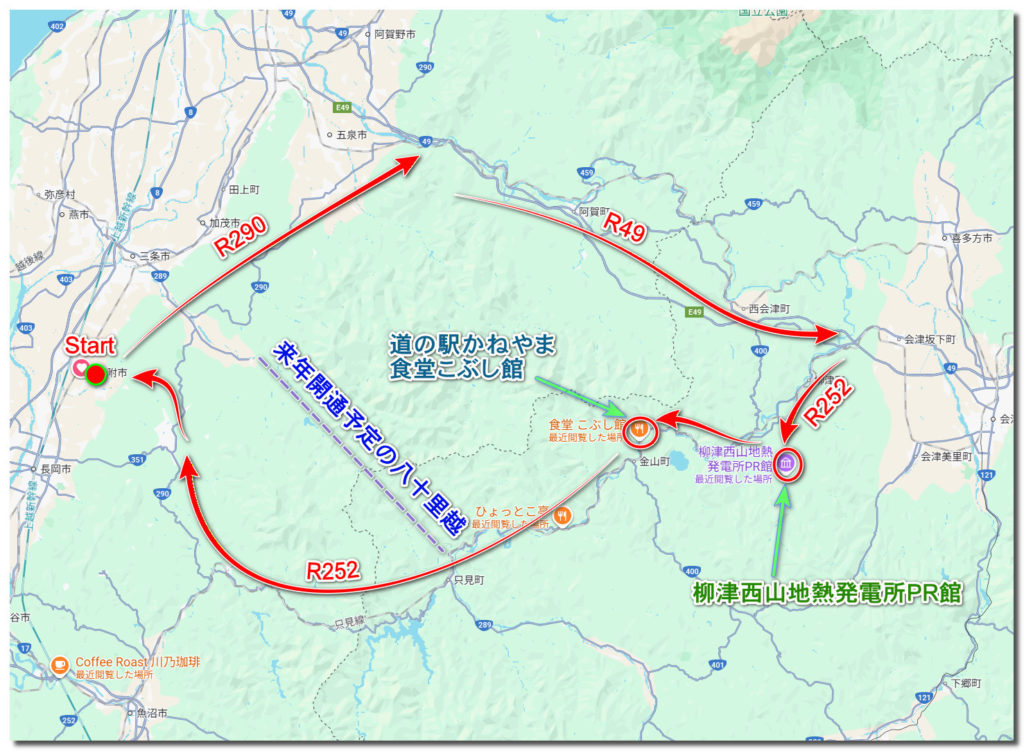 行きはR290で村松経由で馬下へ。R49で会津に入り柳津からR252で只見方面へ。地熱発電所に立ち寄り、その後目的の道の駅かねやま内の食堂こぶし館へ到着。帰りは只見から六十里越で新潟に戻り、R290で帰宅しました。会津周回コースです。