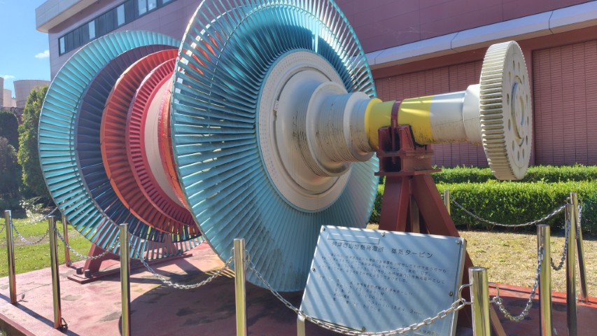 これが発電用のタービン。ここに水蒸気を通して回転させます。