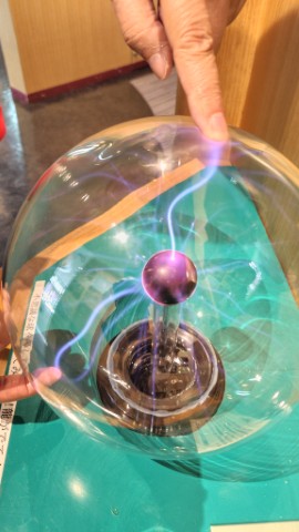 これは不思議な玉という展示物。地元柳津に残る逸話にちなんでの展示のようです。ガラス玉の表面に指をあてるとプラズマが飛んでいるように光ります。おもしろい!