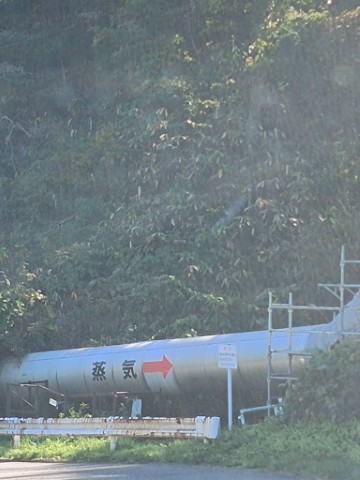 道路から見えるこの大きなパイプには近くで引き揚げた熱水から分離した蒸気が発電所に流れています。