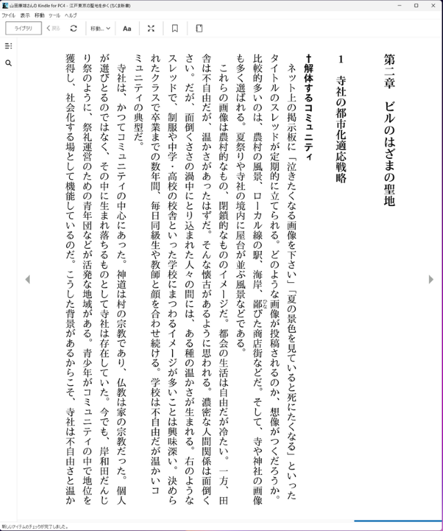 スマホでも便利に読めるのですが、PCの大きな画面で読む快適さもありがたいです。下の写真はWindows Kindle Readerというアプリで本を開いたところです。