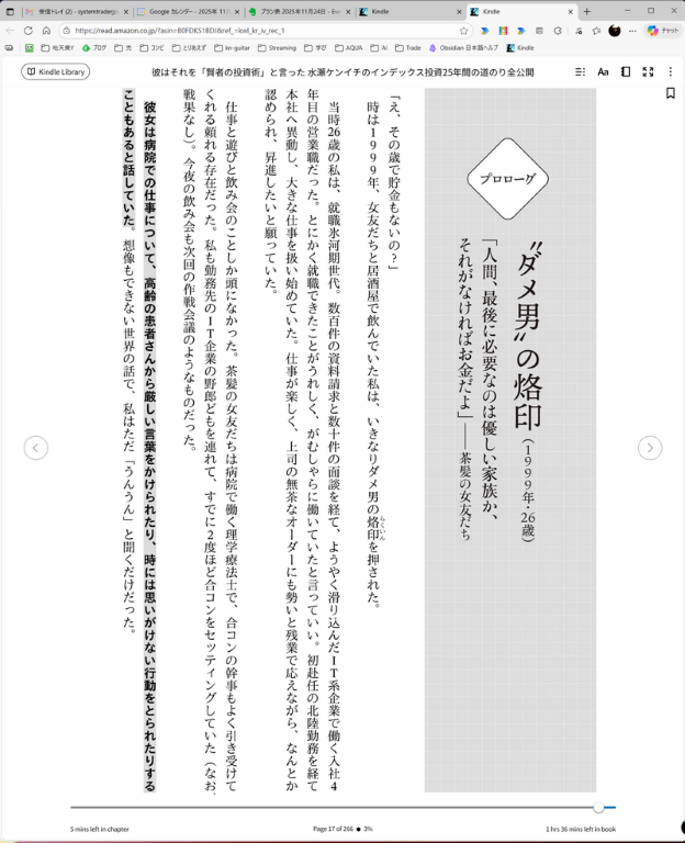 ところがある時、Kindleアプリでなく、Web版のKindleリーダーでも読めることに気づき、こちらの方が画面のフォントなどのイメージがしっくりきます。下の写真です。